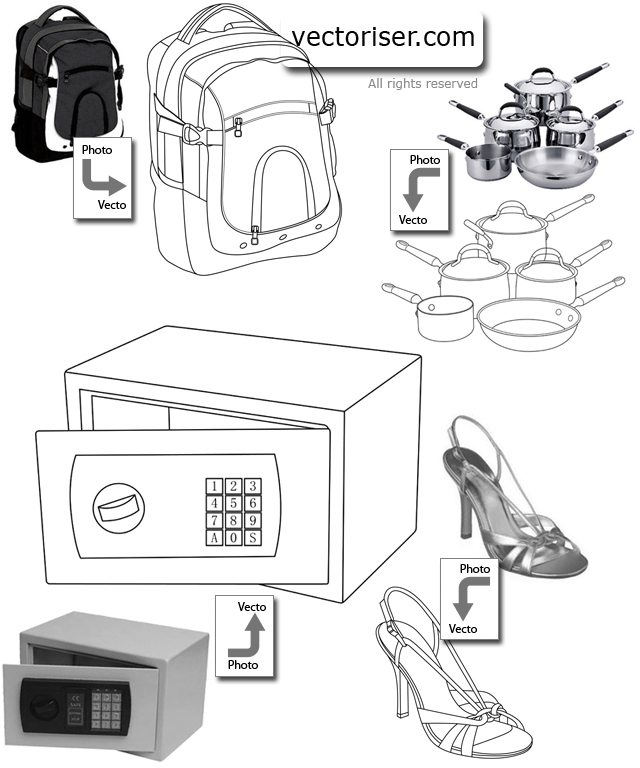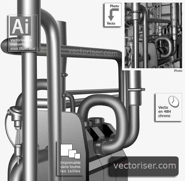Rien de plus simple : A partir des photos que vous possédez (pièces mécaniques, objets, bâtiments, mannequins, etc.), nous réalisons des vectorisations sous Illustrator. Nous vous rendons un document vectorisé contenant les contours. Sur demande nous ajoutons couleurs et textures.