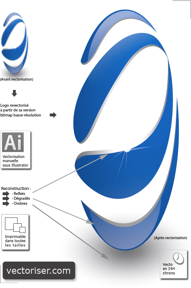 Les tarifs de vectorisation dépendent de la complexité du logo à vectoriser mais également des textures, reflets, ombres, effets et polices à reproduire. Hormis la vectorisation de logos très complexes, le retour du document vectorisé se fait en général sous 24 H à concurrence de 10 logos par jour. Nos tarifs sont dégressifs en fonction des volumes.